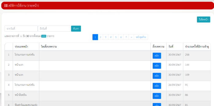 สถิติการใช้งานรายหน้า สามารถเรียกดูได้โดยการเลือกข้อมูลจากช่วงวันที่